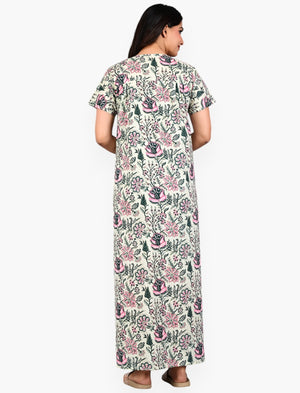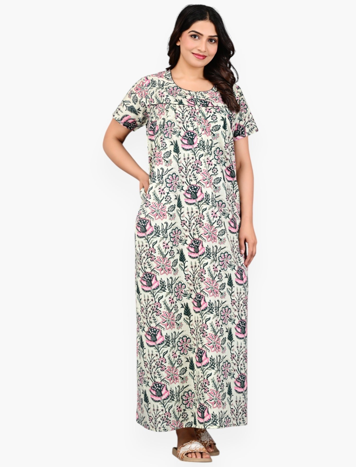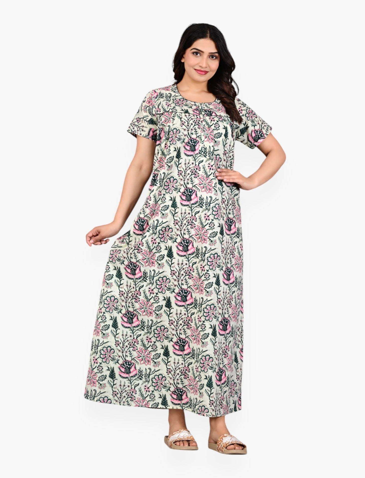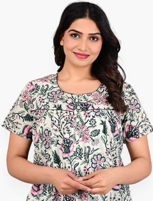 Unwind in ultimate comfort with our Pink Floral Cotton Night Gown, thoughtfully designed to combine style and relaxation. This elegant nightwear is perfect for a peaceful night's sleep or a cozy evening at home.