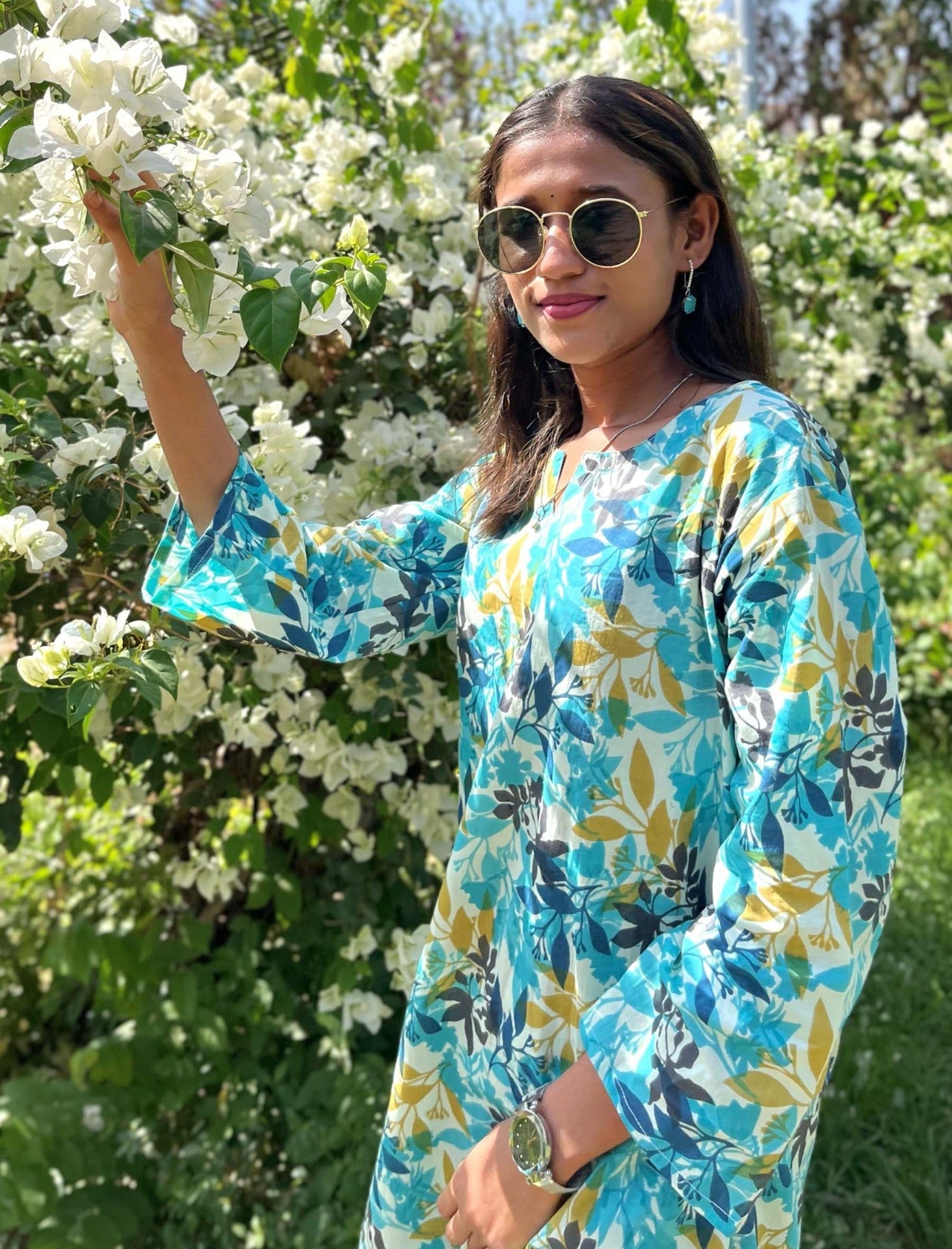 - Color & Pattern: A captivating turquoise base adorned with intricate floral prints, exuding a lively and feminine appeal.